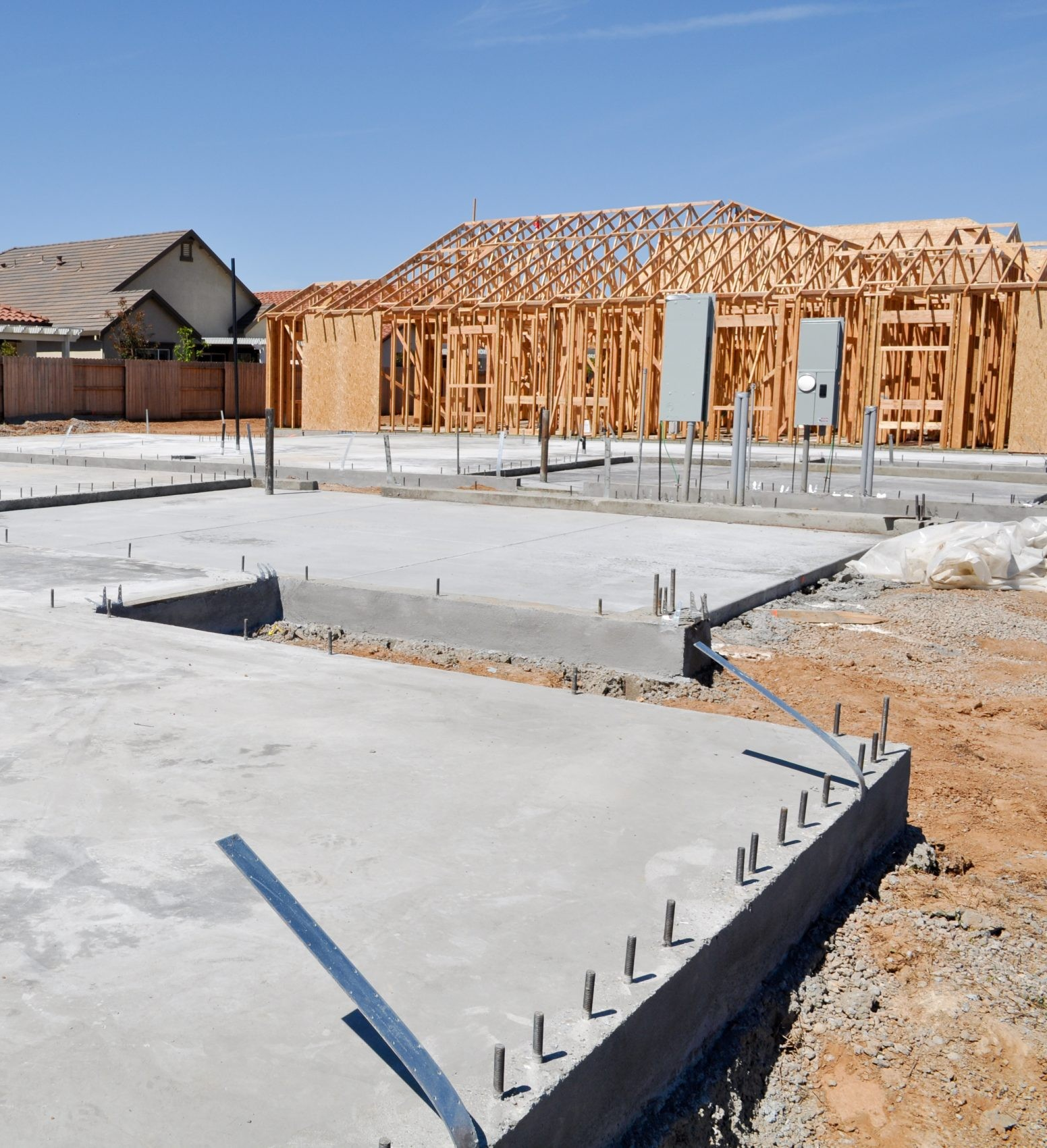 - Slab-on-grade or basement slab: Prepare subbase, vapor barrier, and insulation as specified; place reinforcement (fiber/mesh/rebar); pour, saw-cut control joints, cure, and seal; rough-in for radon or utilities where required.